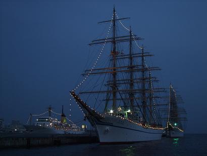 まだ少し明るかったが、ハーバーランドから歩いて新港第一突堤の帆船ライトアップを見に行くことにした。メリケンパークまで来ると停泊しているのが見える。あちこちで三脚を持ったおじさまたちがカメラを構えて撮影中。暗くなるにつれライトアップがまぶしいほどになるのだが、海に落ちるのではないかと心配になった。