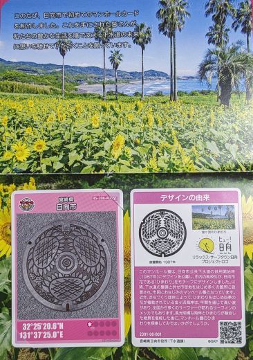 小さめのデザインマンホールです。 上記と大体同じデザインですが、中央の町章と高千穂町の文字の配置が違っています。 |