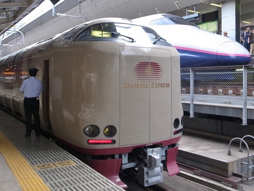 JR東京駅ホーム 寝台特急サンライズと新幹線 (2013年7月撮影) |
