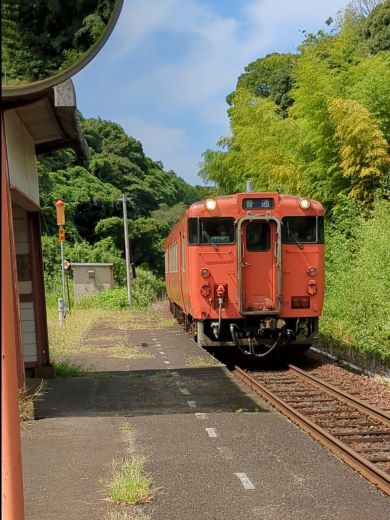 特牛駅ホームに 入線してくる列車 |